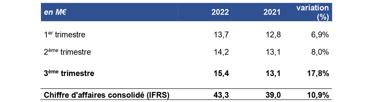 Sur les 9 premiers mois de l’année, le chiffre d’affaires s’établit à 43,4 M€, en hausse de 10,9% par rapport à la même période de l’exercice précédent.