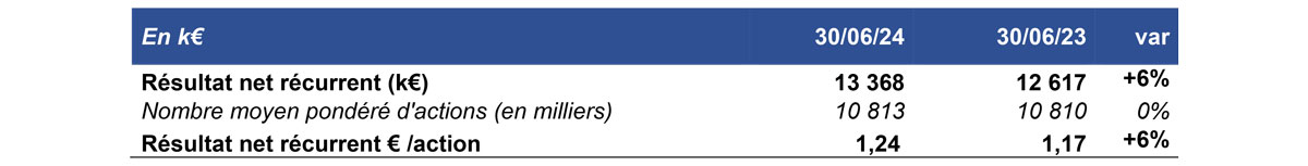 Comme en 2023, le 1er semestre de l’exercice 2024 fait état d’une solide croissance opérationnelle à même de compenser la hausse des charges financières nettes et d’assurer une augmentation du résultat net récurent par action (+6%).
