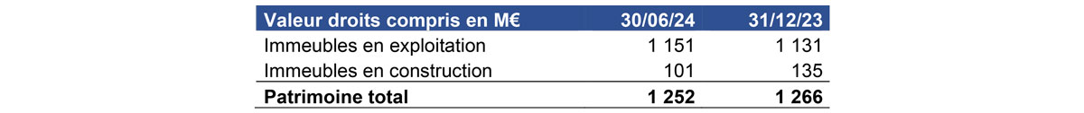 Le taux de capitalisation moyen du portefeuille INEA s’établit à 6,26% au 30 juin 2024 (contre 6,10% au 31 décembre 2023), et la valeur totale du patrimoine – comprenant pour sa valeur d’acquisition le pipeline d’opérations non expertisés – s’établit à 1 252 M€ (droits compris), contre 1 266 M€ six mois plus tôt.