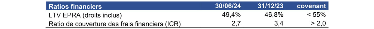 Les instruments de couverture en place sont de type CAP, protégeant la foncière contre la hausse des taux d’intérêts au-delà de leur strike. Ainsi, le coût d’endettement moyen s’est élevé à 3,8% au premier semestre 2024 (contre 2,9% sur la même période l’an passé).