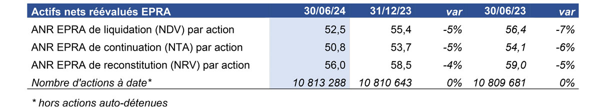 Les actifs nets réévalués EPRA par action sont en retrait de 4 à 5% sur 6 mois du fait de la distribution du dividende et de l’ajustement à la baisse de la valeur du patrimoine.