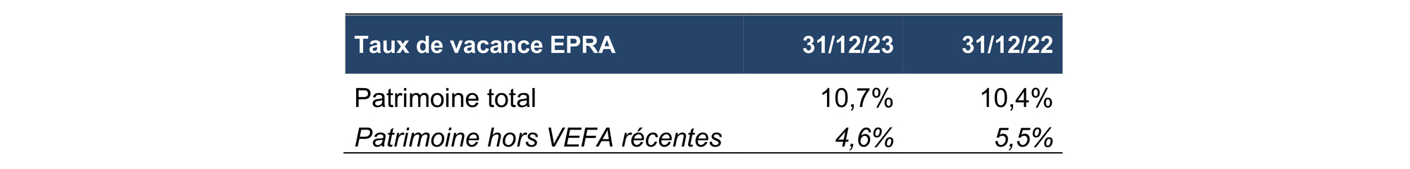 La divisibilité des immeubles d’INEA est un facteur clé permettant de répondre au profil locatif des marchés régionaux (85% des transactions ont porté sur des surfaces de moins de 5.000 m² en Régions en 2023). L’impact des dernières livraisons de VEFA acquises en blanc et dont la commercialisation est ralentie par la succession de crises depuis 2020 explique la stagnation du taux d’occupation. Hors cet impact, le taux de vacance s’établit à 4,6%, en phase avec les taux observés dans les grandes métropoles régionales.