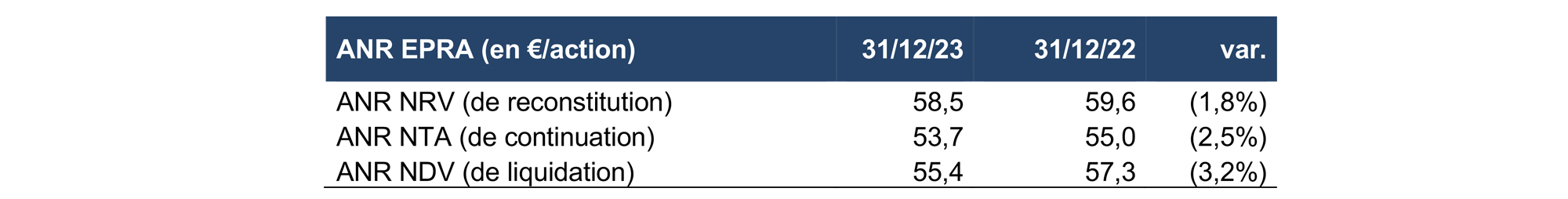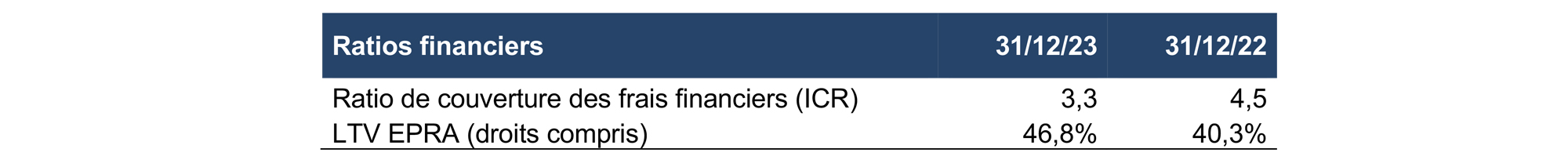 Les covenants bancaires sont respectés à fin 2023. Les ratios d’ICR (Interest Coverage Ratio) et de DSCR (Debt Service Coverage Ratio) s’établissent respectivement à 2,4x et 3,3x. Le LTV EPRA droits compris s’élève quant à lui à 46,8 % (contre 40,3% fin 2022).