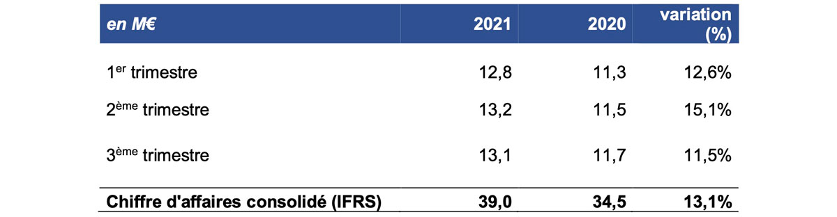 Sur les 9 premiers mois de l’année, le chiffre d’affaires s’établit à 39,0 M€, en hausse de 13,1% par rapport à la même période de l’exercice précédent.