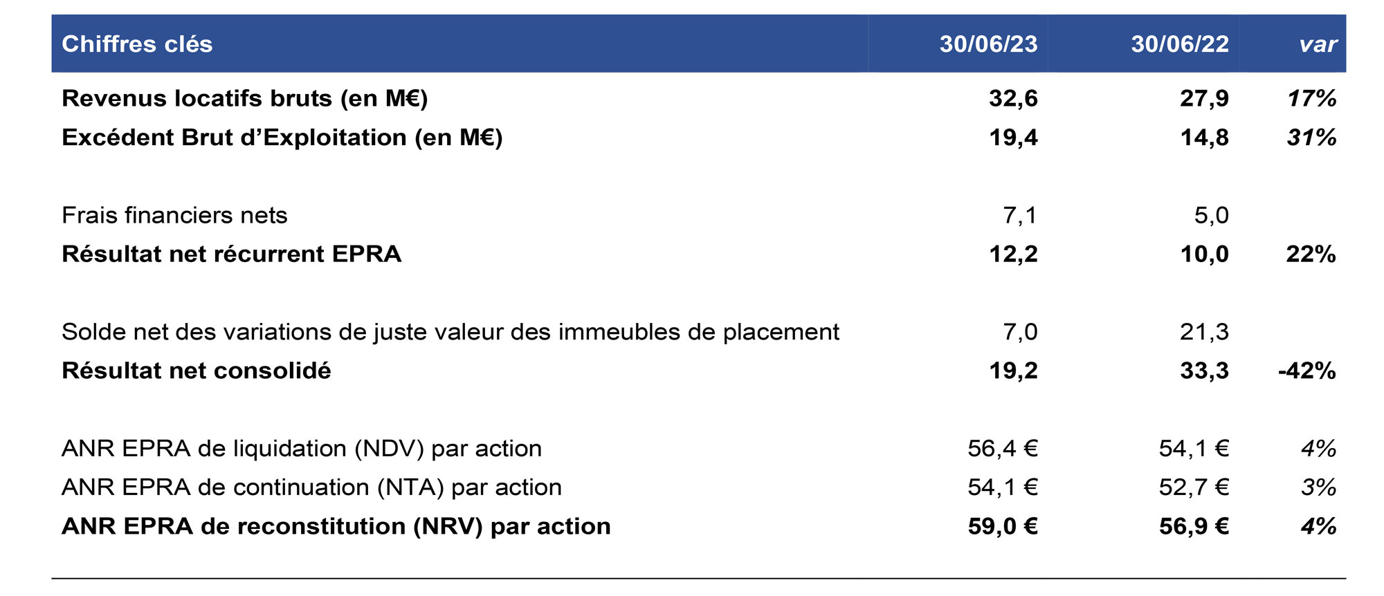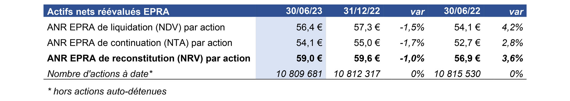 Le RNR EPRA/action est stable, actant l’absorption de l’effet dilutif de l’augmentation de capital réalisée en juin 2022 (nombre d’actions +28%).