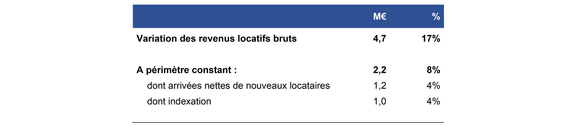 - et pour 8% par l’évolution favorable à périmètre constant, portée autant par l’indexation que par les arrivées nettes de nouveaux locataires.