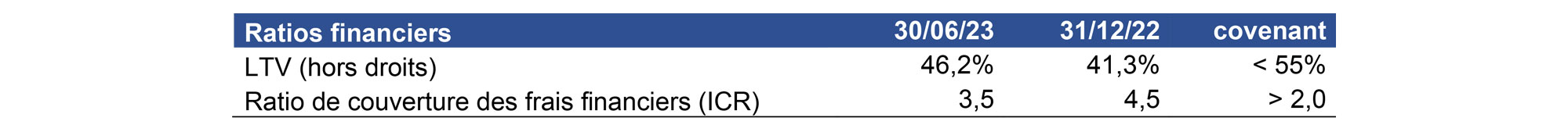 Les covenants applicables à la dette d’INEA sont respectés au 30 juin 2023 :