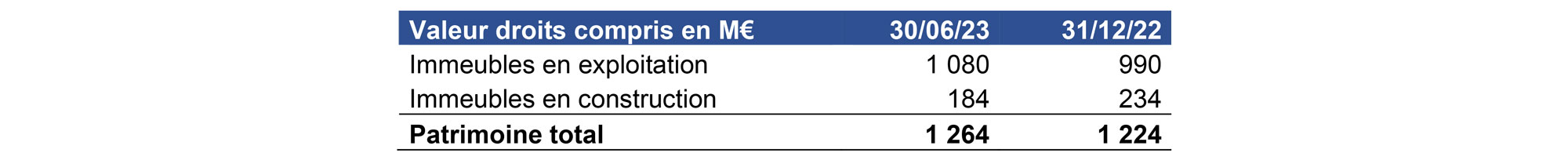 Au 30 juin 2023, la valeur du patrimoine global d’INEA – comprenant pour sa valeur d’acquisition le pipeline d’opérations non expertisés – s’établit à 1 264 M€ (droits compris), en croissance de 3,3% sur 6 mois.