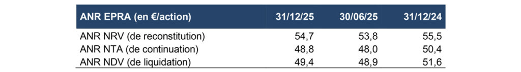 Les actifs nets réévalués EPRA par action s’échelonnent entre 48,8 € (NTA) et 54,7 € (NRV).