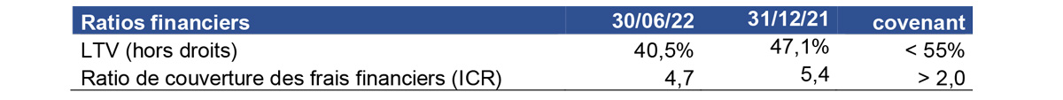 Les covenants applicables à la dette d’INEA sont largement respectés au 30 juin 2022. La réalisation de l’augmentation de capital, couplée à la poursuite de la prise de valeur du patrimoine, a largement abaissé le niveau d’endettement de la Société :