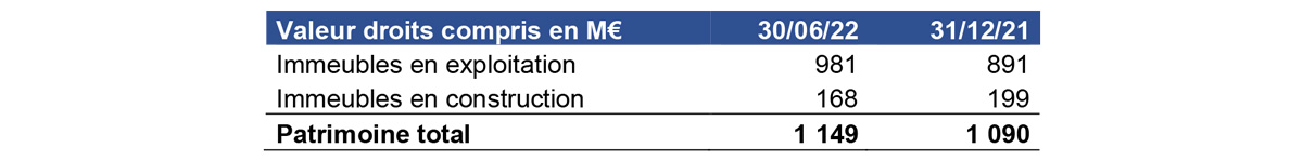 Au 30 juin 2022, la valeur du patrimoine global d’INEA – comprenant pour sa valeur d’acquisition le pipeline d’opérations non expertisés – s’établit à 1 149 M€ (droits compris), en croissance de 5,4% sur 6 mois.