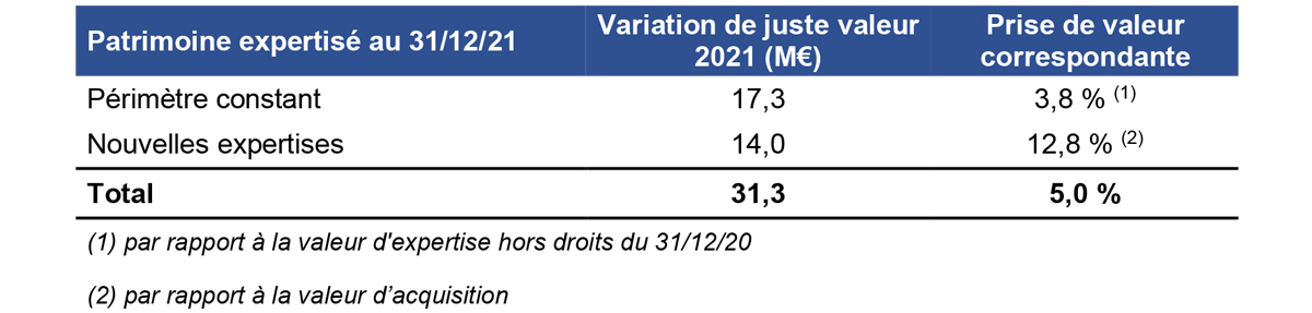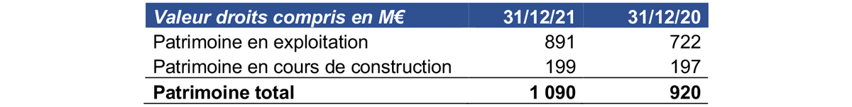 La valeur totale du patrimoine à fin 2021 s’élève à 1.090 M€ droits inclus (contre 920 M€ fin 2020), permettant à la société d’atteindre pleinement son objectif de taille de son patrimoine d’un milliard d’euros à fin 2021 :